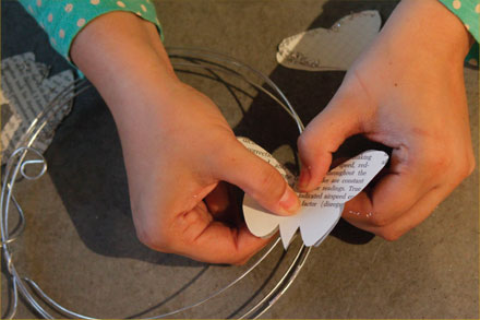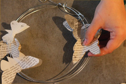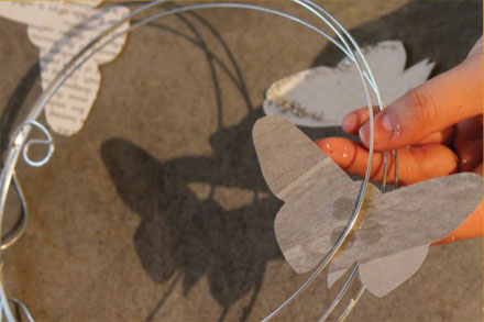 4. Adhere the butterfly pairs to the provided wire wreath form: Take a pair of butterflies and apply 3 or 4 glue dots to the body (not the wings) of one butterfly and place it under the wire form, pressing to adhere.