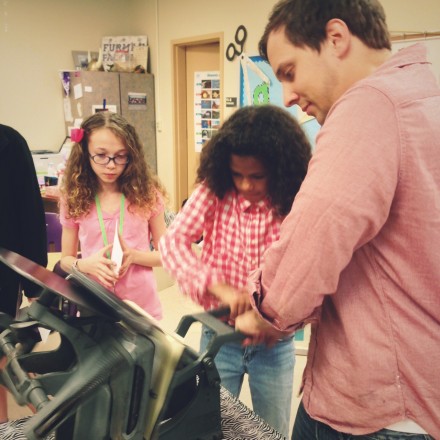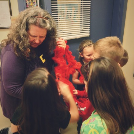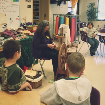 We coordinated 3 local artists to demonstrate their craft/trade throughout the day: Cory Godbey showed 4th graders and kindergarteners his work as a professional illustrator. Deb Potter brought her spinning wheel and felting supplies to 1st and 2nd grade. And Matt Moreau let 3rd and 5th graders try their hand at letterpress printing.